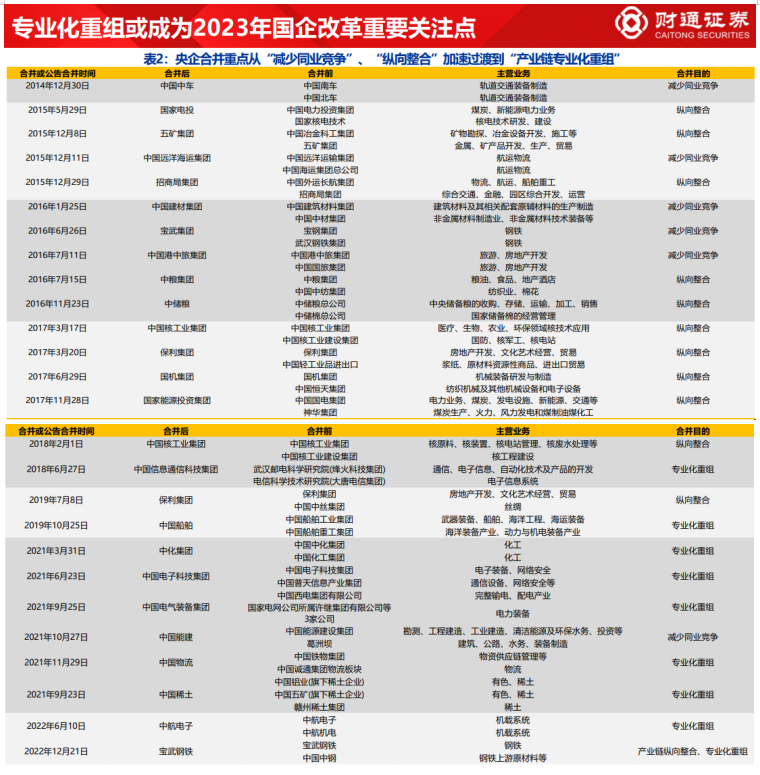 财通证券认为,专业化重组的方式打造现代化产业链,不仅将成为新一阶段国企改革的核心任务,也是实现“中国特色估值体系”的重要方式之一,在政策催化下,央企专业化重组行情值得期待,专业化重组或成为2023年国企改革主线。