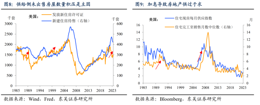 对此,我们考察了自1990年以来的4次高利率导致美国房市大崩溃的原因。如图3所示,由于不同程度的紧缩作用,美国房地产最终“闪崩”的原因都是供需失衡,其中需求端的因素更加关键。