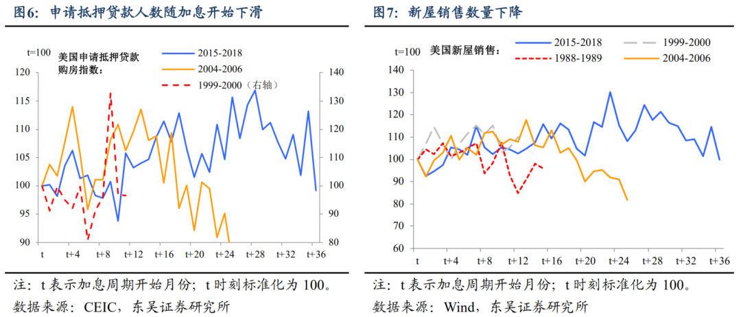 其中2008年为历次以来影响最剧烈的一次:大幅加息425bp中,申请抵押贷款人数最大跌幅为63%,新屋销售快速下滑76%。而如果加息是从低利率水平开始,则对购房需求的削弱便不太明显: 2018年不仅加息起点低,且加息幅度也不大,所以对地产的影响就较小,房屋销量温和回落23%(图6-7)。