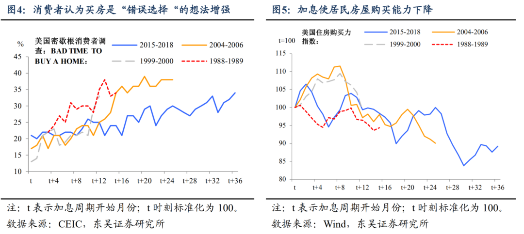 疲软需求,加息幅度和利率水平都重要。在不断走高的利率下,购房需求放缓的传导路径是:高利率—高抵押贷款利率—高利息支付率--购房意愿及需求疲软。具体来看,从加息周期开始,消费者认为买房是个“错误选择”的想法就越来越强烈(图4-5)。
