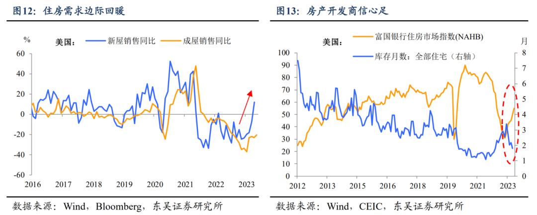 二是供给端,低库存加强开发商的建筑信心,无论是营建许可还是新房开工均开始边际好转(图 13)。与2018年相比,本轮地产周期虽然需求下降的幅度更大,但是供给明显更“克制”,供需失衡的情况反而要更好(库存月数更低),而2018年美国地产下行并没有带来经济衰退。
