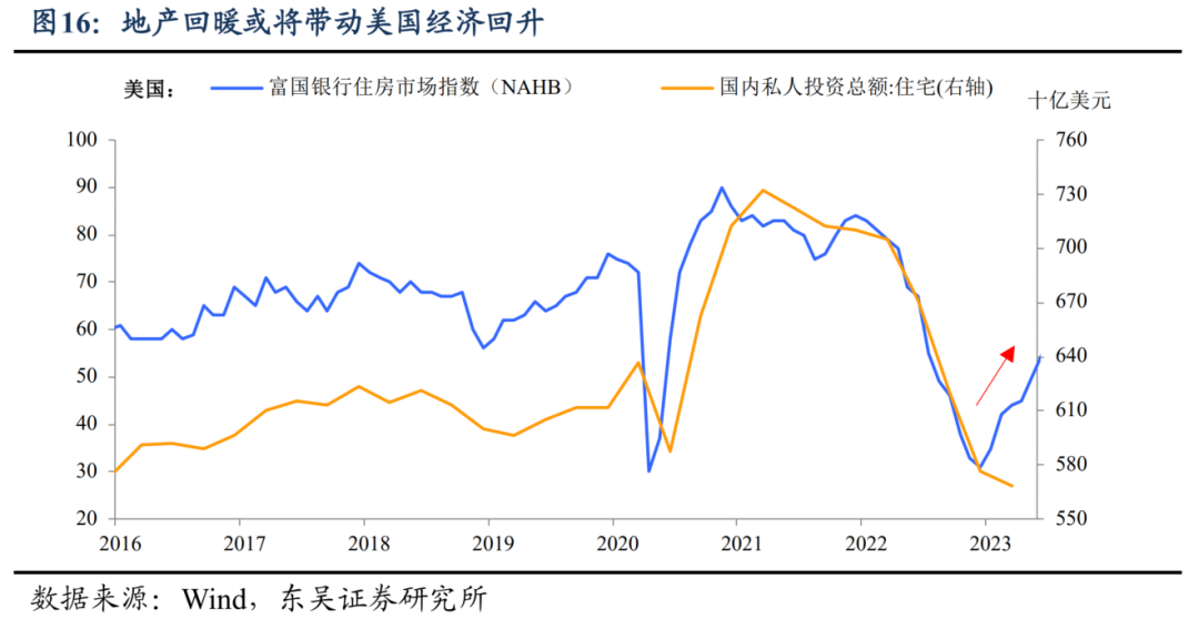 但值得注意的是,房地产软着陆让通胀及就业的“隐忧”再起。美国通胀压力迟迟未解,如果房地产成功软着陆,那么美联储抗击通胀及就业的难度无疑将再进一步(图16)。在此基础上,政策转向则不会太早,也为未来经济和市场平添变数。