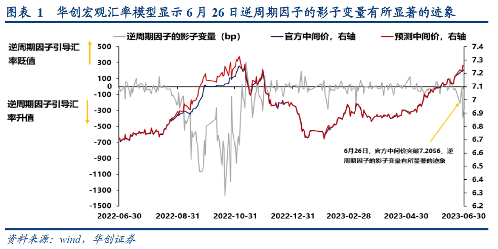 2、政策似乎有着手引导汇率的稳定的意图,本周华创宏观汇率模型捕捉到了逆周期因子的影子变量有所显著的迹象。值得强调的是,这是4月初本轮贬值以来首次观测到连续交易日显著的逆周期因子影子变量。