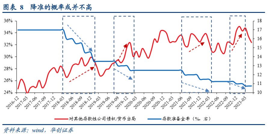 3、当下央行对其他存款性公司债权占总资产的比重是2022年9月以来的最低值,对应短期央行降准的概率或并不高。历史来看,央行降准通常发生在对其他存款性公司债权占总资产的比重较前期高点明显提升的时间段。当下这一比例是2022年9月以来的最低值,对应短期央行降准的必要性不高。