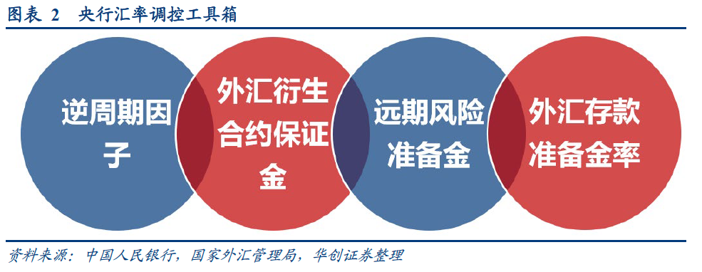 2、重点关注“综合施策”的表述,对应后续央行有配合动用其他汇率调控工具的可能。央行对汇率调控的工具箱中包含了诸如逆周期因子、外汇衍生合约保证金、远期风险准备金、外汇存款准备金率等,工具箱种类充足、空间充足。