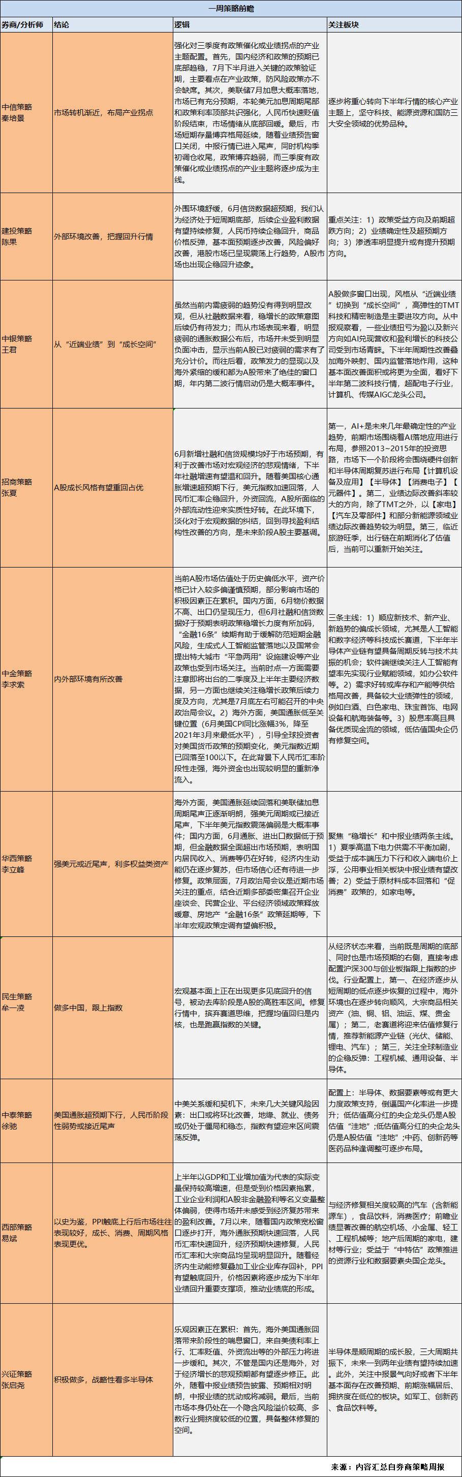 首先,国内经济和政策的预期已底部趋稳,7月下半月进入关键的政策验证期,主要看点在产业政策,防风险政策亦不会缺席。