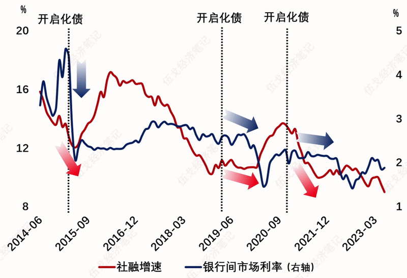 过往三轮地方隐债化解开启时,货币政策似都有一定程度的配合,银行间市场利率有所下降。尽管利率趋降,但商业银行受到化债的影响,往往不愿主动放松甚至还会收紧放贷条件。加之置换债挤压其它债券的发行,金融环境总体呈现“宽货币+紧信用”的组合。