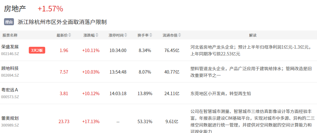 房地产板块今日活跃,荣盛发展、顾地科技等涨停。