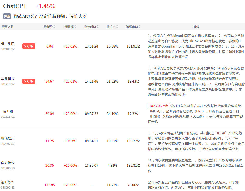 ChatGPT概念今日反弹,省广集团、华是科技、福昕软件等多股涨停。