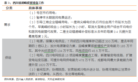 湖北的水电、火电占比较为平均,调节弹性较强。四川的电力装机结构较为单一,水电占比约八成,但准备较为充分,一方面在需求侧引导错峰用电、节约用电,另一方面确保电煤库存,提升发电和输电能力,并争取留川和外购电量,重演类似去年限电事件的可能性不大。
