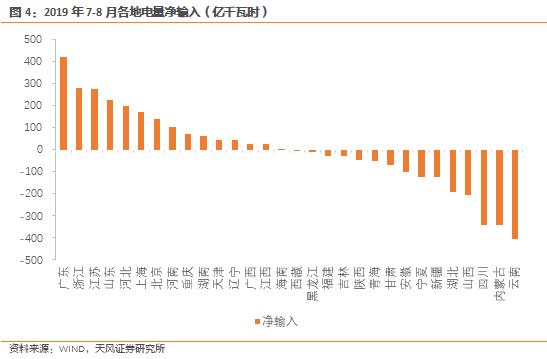 受影响的还有依赖外来电的省份。从电量净输入的情况来看,7-8月电量净输入规模较大的地区主要包括华东(上海、浙江、江苏)、华北(北京、山东、河北)和广东。四川和湖北的发电不足或进一步加剧华东区域的电力缺口。