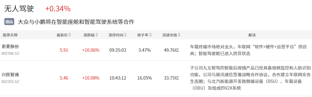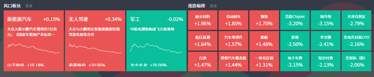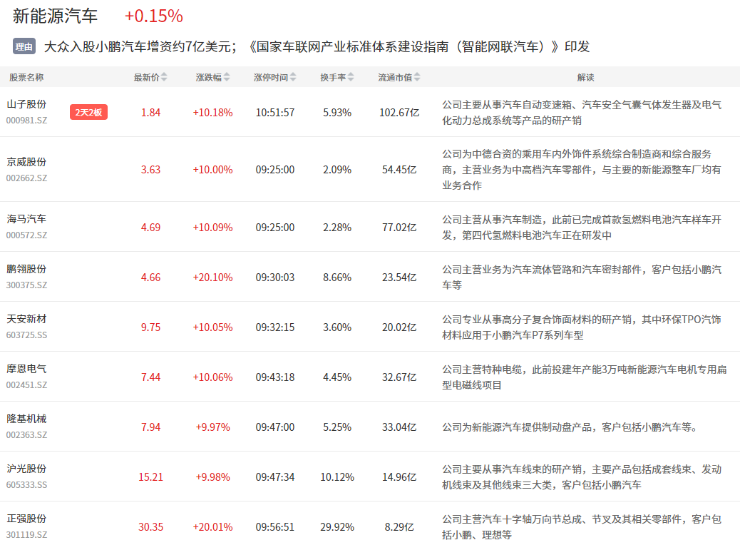 新能源汽车板块今日走强,山子股份2连板,京威股份、海马汽车、鹏翎股份等多股涨停。无人驾驶板块也有表现,索菱股份、兴民智通等涨停。