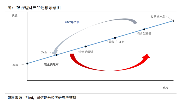 其指出,随着无风险收益下降和信用扩张提升,居民风险偏好逐步提升,财富产品配置需求涌现:从存款、现金类理财到债券基金、“固收+”理财产品,最后到权益基金;同时货币宽松预期、宽信用节奏也将加快这一趋势。从实际情况来看,这一过程已经开始发生。