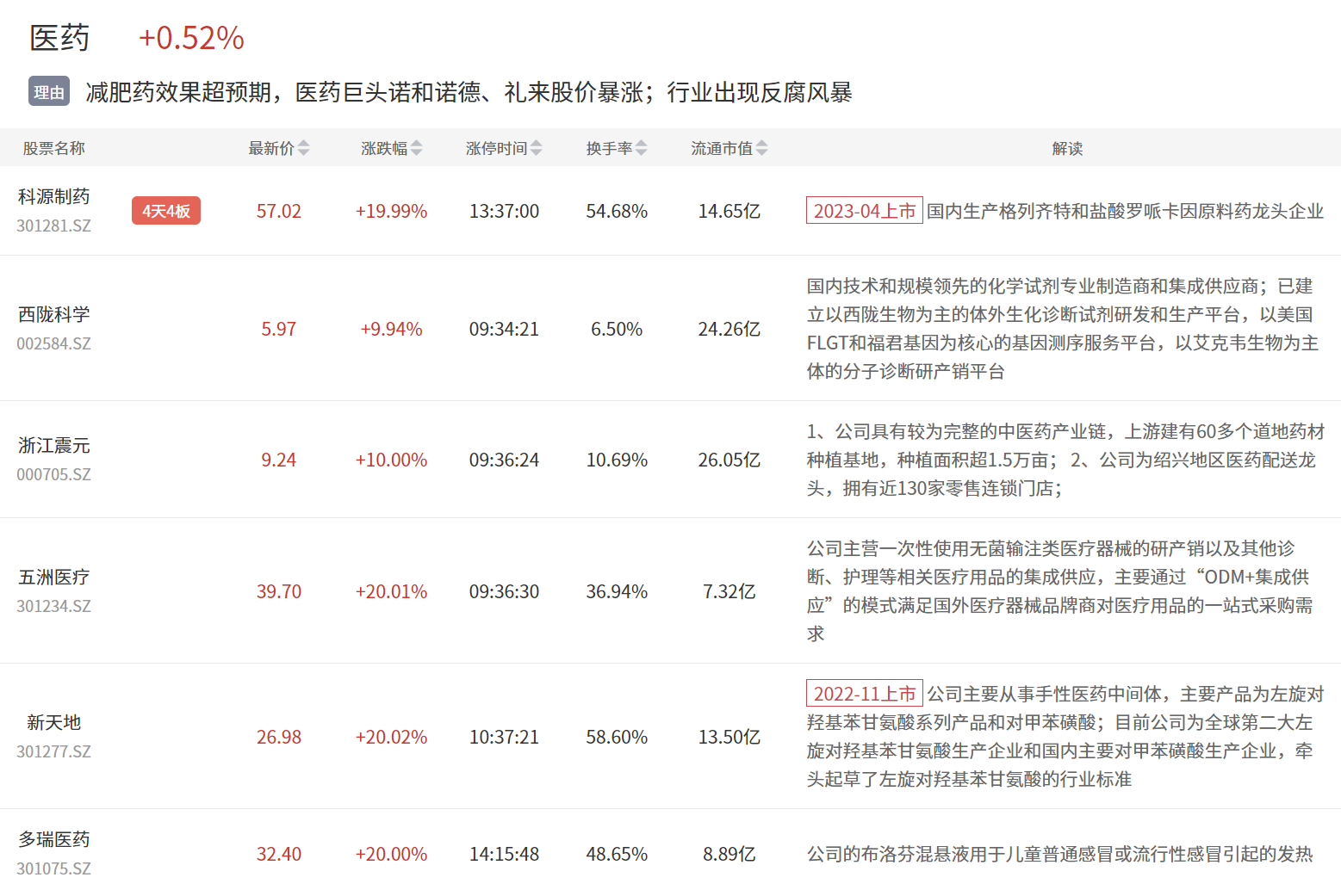 医药板块今日继续大涨,科源制药4连板,西陇科学、浙江震元等涨停。