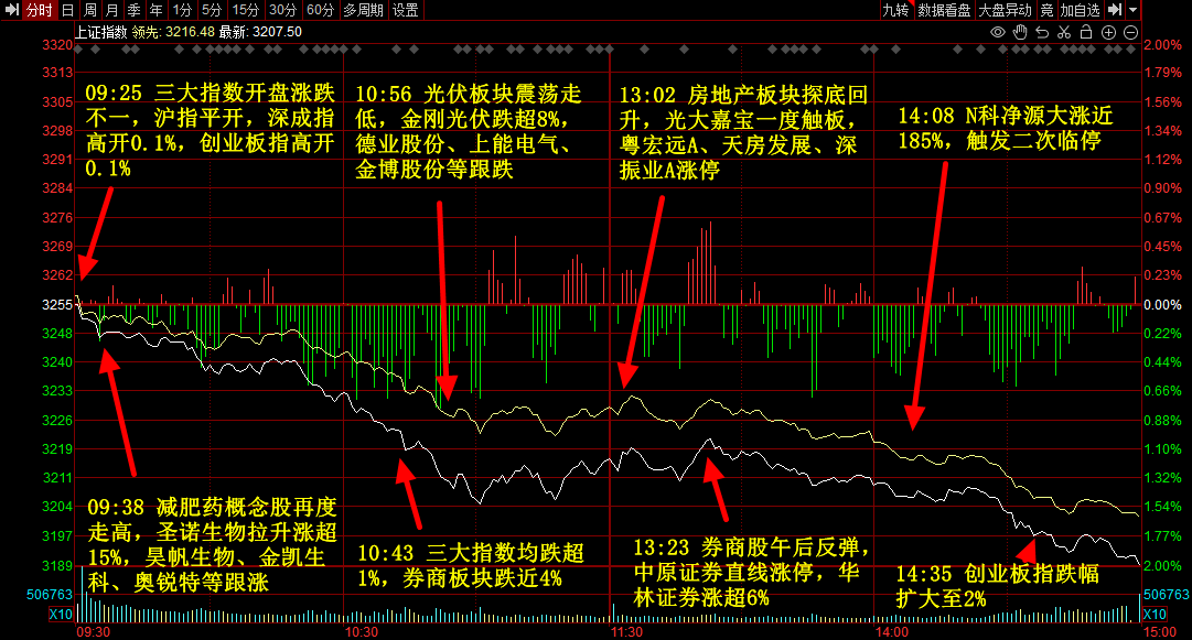 三大指数今日全线调整,沪指尾盘失守3200点关口,深成指、创业板指均跌超2%。券商、金融科技股大幅下挫,锦龙股份、恒银科技跌停,天晟新材、天利科技跌超10%,红塔证券、首创证券跌超8%。医药股逆势走强,新天地、五洲医疗、科源制药、多瑞医药、圣诺生物20cm涨停,塞力医疗4连板,西点药业、港通医疗、金石亚药等涨超10%。新股及次新股继续活跃,N科净源、C威力均大涨触发临停。个股呈现普跌态势,两市超4500股飘绿,今日成交7644亿元。