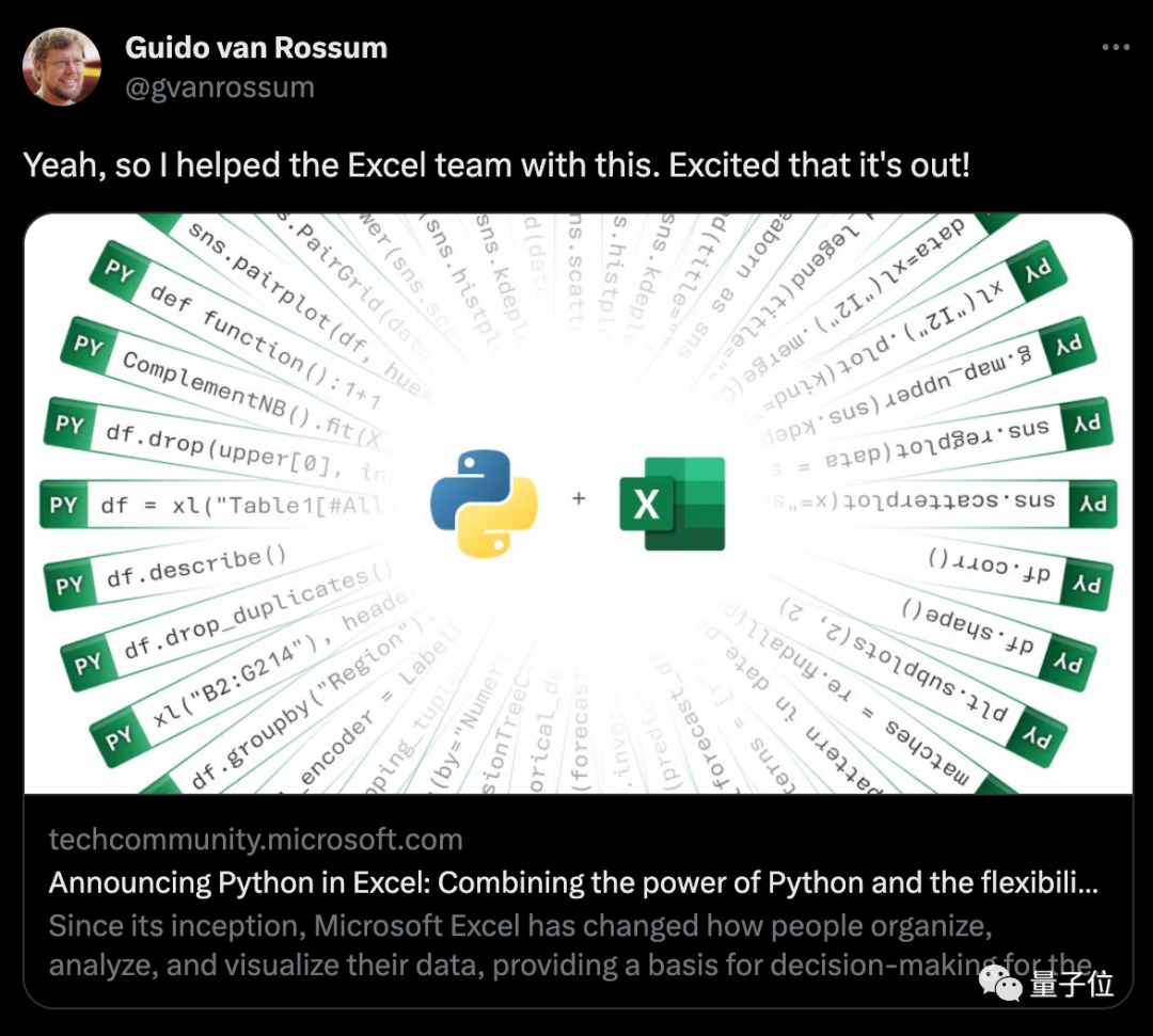 值得一提的是,这次Excel和Python的合作,Python之父吉多·范罗苏姆有提供帮助。