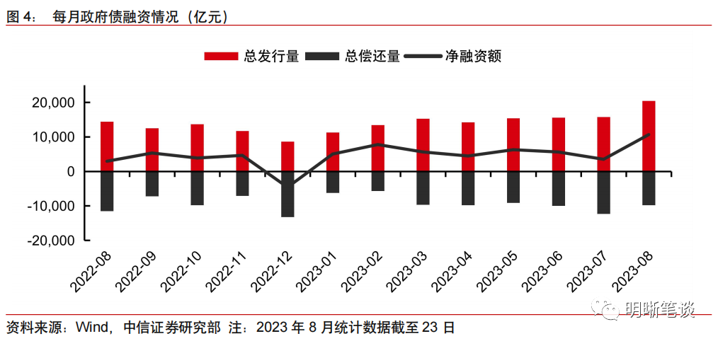 政府债发行放量,缴款压力会导致银行资金融出意愿与能力降低。截至2023年8月21日,8月政府债发行已经超过2万亿,较上个月全月多增4641亿元,而今年前7个月的月平均发行量仅为1.4万亿左右,本月发行量远高于今年以来各月的发行规模;同时,净融资额也到达近一年的高位,除本月外,近一年每月的净融资额平均为0.4万亿,而目前8月净融资额已超过1万亿。银行作为配置利率债的主力,当前政府债加速不仅直接占用了其资金,同时为了后续承接地方债供给,银行业需要提前储备一部分流动性,导致银行向同业融出的意愿与能力降低。