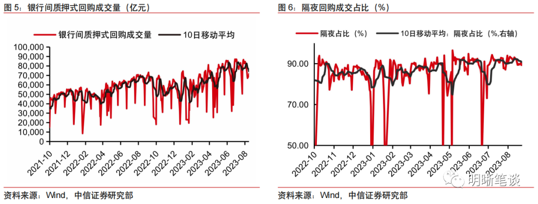 市场加杠杆情绪过热也可能导致央行阶段性控制资金套利与空转。8月以来,质押式回购日成交量震荡上行,连续8个交易日突破了8万亿;隔夜回购成交量占比也持续位于极高水平,截至23日所有交易日均保持在89%以上,其中11个交易日超过90%,反映出市场加杠杆操作较为活跃,而资金较为拥挤可能会导致债市脆弱性和敏感度增加。8月4日,央行货政司司长邹澜表示要“防止资金套利和空转,提升政策效率”,体现了对资金套利、脱实向虚等问题的关注。我们认为,央行有可能通过窗口指导等方式,建议大行及政策行控制资金融出规模,抑制金融空转。