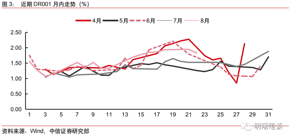 月中是税期缴款日,会阶段性抽走银行间部分流动性,从以往经验来看,税期缴款往往会带动市场资金利率走高。每月15日前后通常为“缴税高峰”,资金面一般较为紧张。参考今年前几个月的月内数据来看,大体上每月13日至20日这段时间内,资金利率均会出现较明显的抬升。今年4月到7月,税期前后的这七天内DR001平均抬升了36bps,其中4月抬升最多,高达91bps。对比之下,8月份DR001在月中出现较明显的上行,部分属于季节性的正常变化。