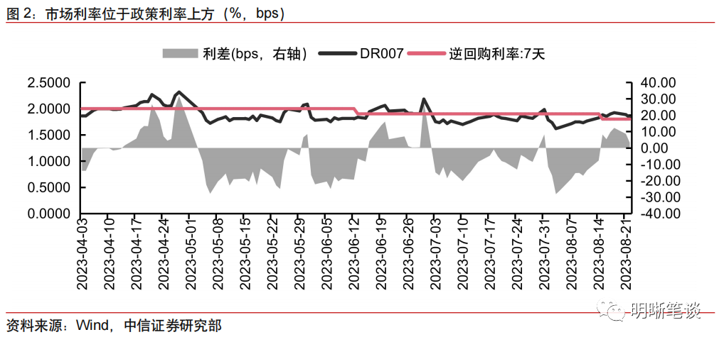 作为短端利率的锚,7天逆回购降息10bps后,市场利率并未同幅度下行,DR007目前处于7天逆回购利率上方。8月15日,央行公告下调7天逆回购利率10bps至1.80%,DR007在降息后利率中枢并没有随之调整,导致资金利率所处位置由政策利率下方变为政策利率上方,目前依然保持在1.80%上方,在8月18达到1.92%,高出7天逆回购12.21bps。