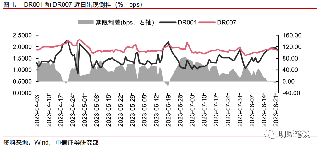 资金利率自8月起震荡上行,尤其是DR001在中旬快速冲高,最高上行至1.94%,与DR007发生倒挂。跨月结束后,资金利率短暂下行,于8月3日到达了低点,当日DR001达到1.07%,DR007触及1.62%。此后,资金利率震荡回升,尤其是DR001在中旬迅速抬升,于8月18日达到1.94%,超过了当日DR007的1.92%,与DR007利率倒挂,期限利差达到-1.33bps,8月21日这一利差达到了-5.88bps。