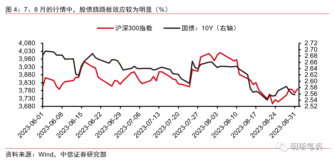 (3)市场风险偏好回升,股债跷跷板持续影响债市情绪。近期落地的政策工具中,无论是减半印花税征收、暂缓IPO等活跃资本市场工具,还是央行调整首付比下限、调降存量房贷利率等宽地产政策工具都有助于提升市场风险偏好,进而对股市形成利好而影响债市情绪。回顾7-8月债市的主要调整阶段,均伴随着权益市场的走强,可见稳增长政策预期博弈阶段,股债跷跷板对长债利率影响的权重抬升。往后看,8月PMI边际好转而生产和新订单指数均回归荣枯线上,政策面仍有存款利率调降、地方政府化债等工具尚未全面落地,我们预计资本市场风险偏好回升的过程仍将延续,进而对债市形成较多情绪扰动。