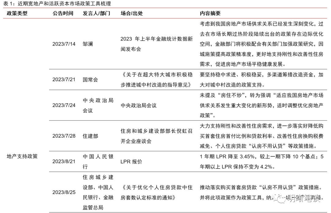 (3)支持信贷修复目标下,宽货币仍有空间。7月14日,上半年金融统计数据新闻发布会与7月24日的政治局会议提到加大逆周期调节力度后,8月15日超预期降息体现了央行对这一诉求的回应。在2023下半年工作会议中,央行强调加大信贷投放的支持力度,并要求“指导商业银行依法有序调整存量个人住房贷款利率”;二季度货政报告不再强调“总量适度、节奏平稳”,并要求“更好发挥货币政策工具的总量和结构双重功能”,宽货币支持宽信用态度较为明确。当下存量房贷利率下调等政策工具已经落地,在MLF到期压力较高,专项债集中发行等制约下银行间流动性市场仍然偏紧,不排除后续降准落地的可能性。此外,8月MLF降息后5年期LPR报价并未伴随调降,若后续信贷修复进度不及预期,则不排除年内进一步降息的可能性。