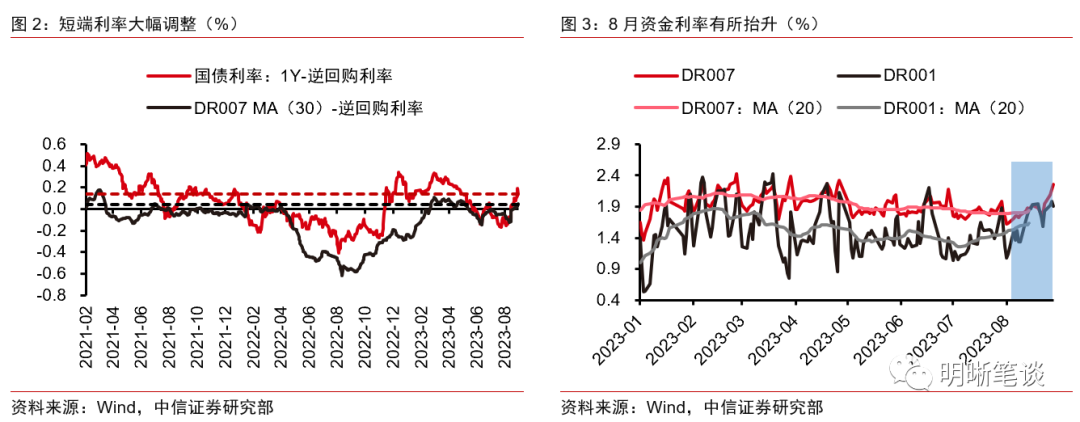 (2)资金利率居高不下,促使短端利率大幅调整。尽管8月票据利率中枢较低指向信贷需求尚未全面回暖,但在专项债发行节奏加快、放资金空转套利诉求以及超储率偏低等因素的影响下,隔夜和7天利率在月中税期和跨月时段抬升斜率明显加大。尽管央行在税期和跨月阶段维持了千亿以上的逆回购投放规模对冲,但缓解紧资金压力的效果较为有限,同时OMO10bps的降息并未在资金面有所体现,隔夜7天利率与政策利率持续倒挂。受此影响,短端利率在8月下旬的调整中回升幅度更高,1Y国债利率一度回升至1.98%,超过了6月降息前的水准。