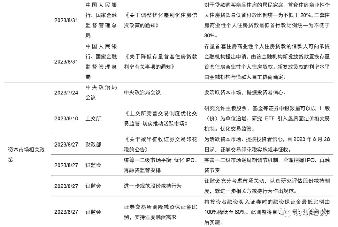 (1)稳增长政策集中落地是8月下旬以来长债利率调整的主要驱动。7、8两月是稳增长政策密集出台期,其中对债市影响较大的主要包括宽地产、宽财政、活跃资本市场、稳汇率以及地方债务化解等方面的政策。具体来看,7、8两月长债利率较为明显的两个调整阶段分别出现在7月24日政治局会议后,以及8月27日证监会释放减半印花税征收、优化IPO等重要利好后,而其余时段类似于认房不认贷、存量房贷利率调降、首付比下限调整等宽地产工具也对债市形成了一定冲击。7-8月政策面因素扰动债市的逻辑主要可以划分为政治局会议后的政策预期发酵,以及8月以来具体政策工具落地后的预期差;而8月降息落地前长债利率已出现边际回落的迹象,主要是上旬的政策力度不及预期,而下旬利率V型回升,则是由于活跃资本市场、宽地产政策工具超预期。基于这个逻辑,虽然本周宽地产政策集中落地对债市预期形成了较大的冲击,但后续政策面阶段性利空出尽反而可能形成利好。