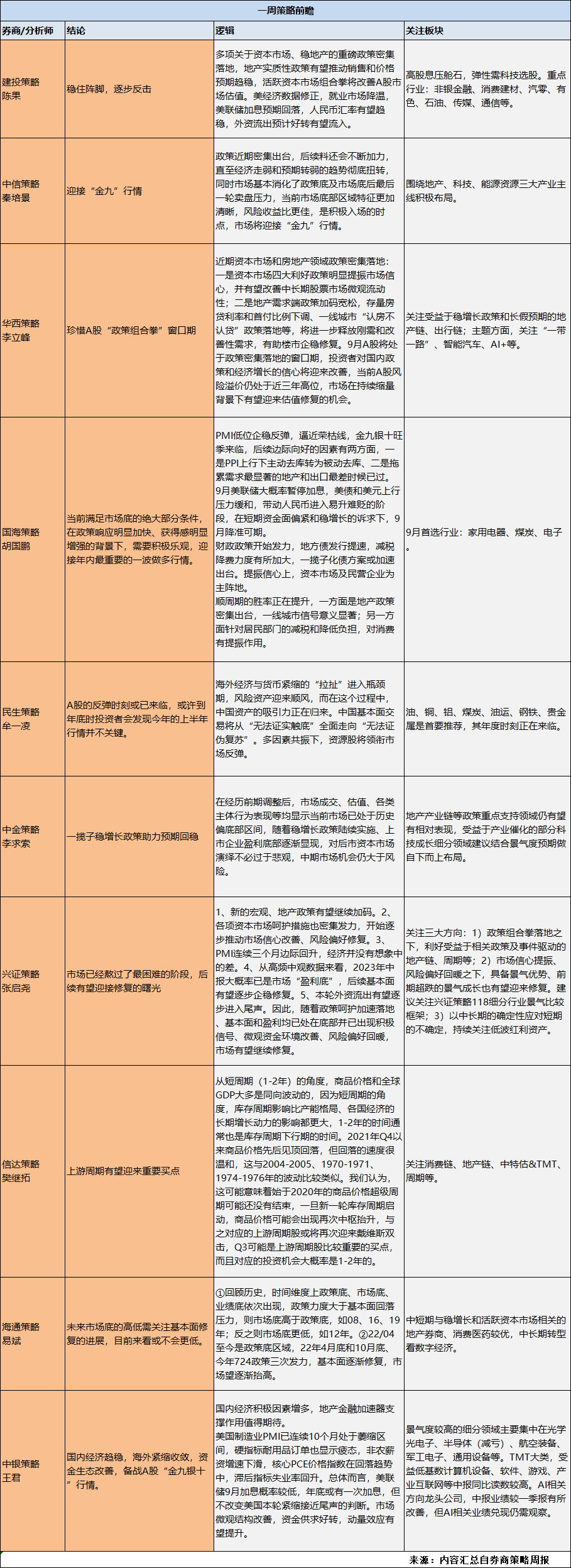 中信策略秦培景团队指出,迎接“金九”行情。政策近期密集出台,后续料还会不断加力,直至经济走弱和预期转弱的趋势彻底扭转,同时市场基本消化了政策底及市场底后最后一轮卖盘压力,当前市场底部区域特征更加清晰,风险收益比更佳,是积极入场的时点,市场将迎接“金九”行情。