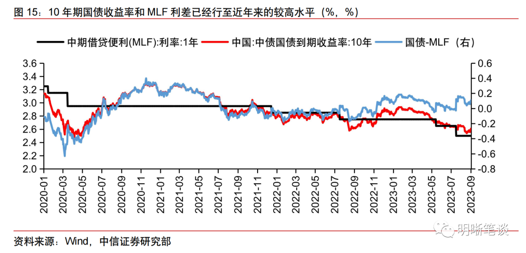 政治局会议后,债市一路长牛的趋势出现扭转。短期而言,稳增长政策进一步加码的可能依旧存在,债市可能依旧处于相对逆风的环境之中,不过,鉴于当前利率点位已经偏高,债市进一步调整的空间正在逐步收窄,利率可能逐步从快速上行转向高位震荡。今年2月以来,债市一路高歌猛进,长端利率一度突破去年2.58%的低点水平,而政治局会议后,一系列积极政策带动市场风险偏好快速提升。股债跷跷板效应下,债市遭遇快速回调。短期来看,经济基本面磨底的大环境下,稳增长政策仍有进一步发力的必要,债市投资者对政策带动利率走高的担忧情绪也较为浓烈,因此,利率可能依旧面临调整的风险。不过,从10年期国债和MLF的利差来看,截至9月4日,10年期国债收益率高于MLF利率约15 bps,处于过去三年来的75%分位数水平左右,债市进一步调整的空间也可能有限,预计利率可能从前期的快速上行转向高位震荡。