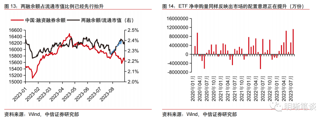 7月政治局会议后,政策底已经明确,市场风险偏好随之逐步抬升,市场底可能也已经确认。7月政治局会议后,政策整体的积极基调已经明确。随着降息、活跃资本市场以及放松房地产市场等一系列政策快速落地,政策底已经明确,且政策仍处于持续发力过程之中,未来有望推出更多瞄准稳增长领域的政策。在政策筑底、逐步发力的过程中,权益市场的整体风险偏好也随之逐步抬升,不论是逐步上行的两融余额在流通市值中的占比,还是持续走高的ETF净申购量,都反映出投资者的配置意愿正在不断走高,市场的底部也可能已经确定。