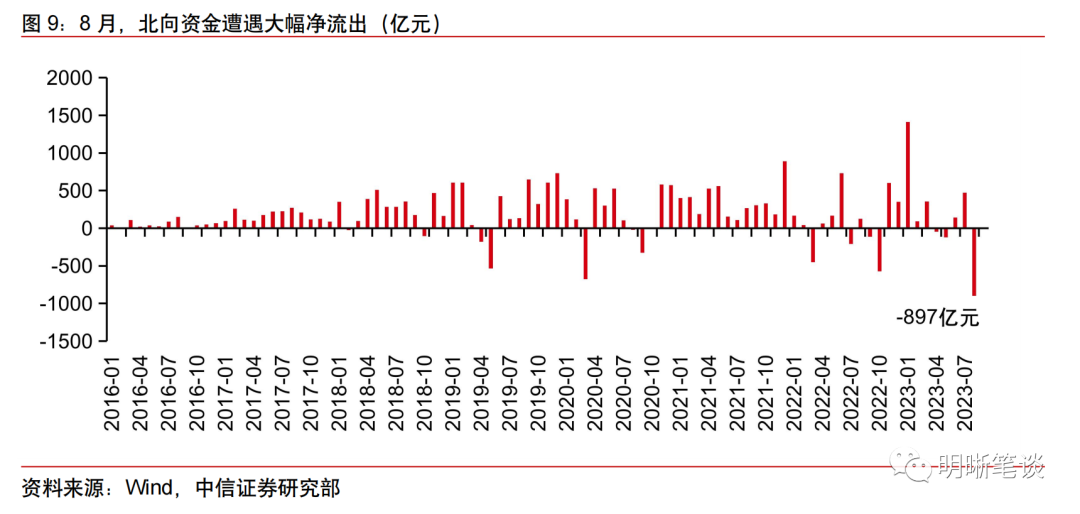 海外:利率和汇率压力有望双双缓解。8月,北向资金大幅净流出接近900亿元,这一方面是因为在通胀黏性和经济韧性的双重推动下,10年期美债利率大幅上行,另一方面是因为人民币汇率在8月也承受了较大压力。随着市场充分定价美国通胀黏性、美国经济韧性弱化以及我国基本面进入磨底阶段,预计美债利率上行和人民币汇率贬值这两大不利因素将逐步缓解,北向资金流出压力可能减弱,A股定价逻辑有望重回国内基本面。