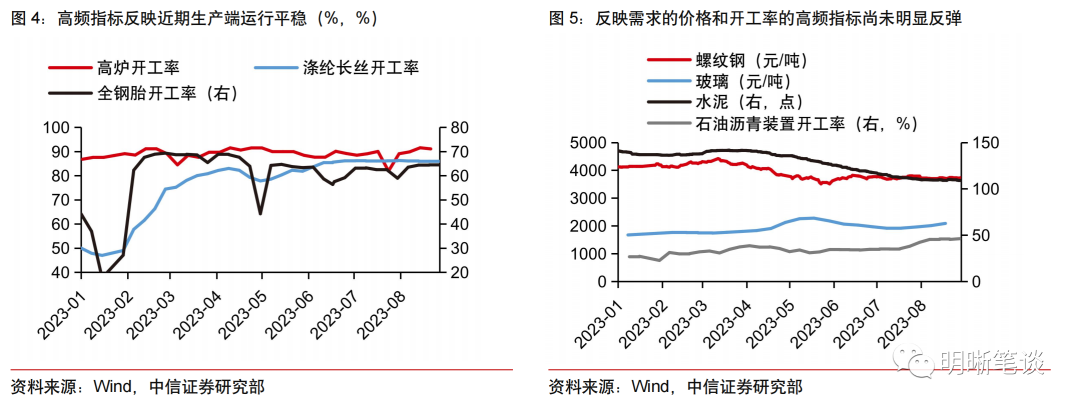 8月,制造业PMI延续低位上行趋势,但仍低于荣枯线水平,结合8月高频数据来看,当前经济基本面磨底的态势已经明确,但尚未完全摆脱增速下行的压力。8月,制造业PMI录得49.7%,为今年5月低点以来的连续第三个月回升,反映出经济磨底的态势进一步明确。新订单指数自今年4月以来首次回升至荣枯线以上,显示内需不足这一制约经济复苏的主要问题也出现小幅边际改善迹象。不过,在PMI低位回升的同时,也需注意到制造业PMI连续五个月低于荣枯线的事实,且考虑到近期反映生产和需求的多类高频数据多表现为小幅回升或震荡走平,并未出现明显修复的迹象,我们认为当前经济基本面仅处于磨底阶段,尚未迎来转向快速复苏的拐点。