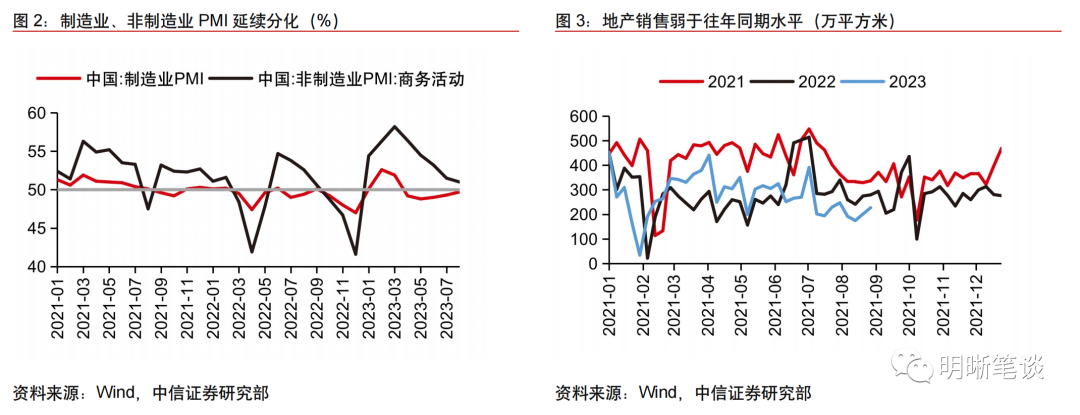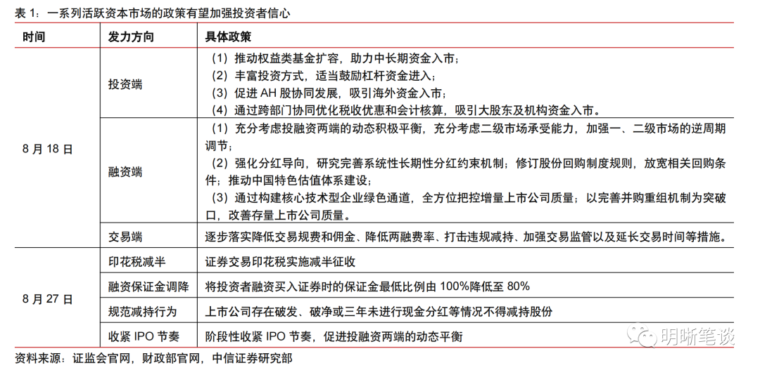 7月政治局会议之后,政策积极的基调已经明确。政策底已经显现,当前处于政策持续发力期。7月政治局会议强调,“当前经济运行面临新的困难挑战,主要是国内需求不足……加大宏观政策调控力度,着力扩大内需、提振信心、防范风险”,既指出了当前复苏进程偏弱的事实,也为未来的政策定下积极基调。政治局会议中具体部署的各项政策快速落地:1)降息。8月15日,OMO和MLF利率同时调降,本次降息距离6月的降息仅过去两个月,而上一次在如此短的时间内连续降息还需追溯至2020年初疫情爆发时期;2)活跃资本市场。政策分两步发力,8月中旬,政策从投资、融资和交易三个层面入手,对政治局会议中“活跃资本市场、提振投资者信心”的安排做出了回应,8月下旬,印花税率在2008年后再度出现减半征收,减持新规和放缓IPO等一、二级市场协调的政策也同时落地,市场活跃度和投资者风险偏好均随之快速提升;3)放松房地产市场。继认房不认贷政策在部分一、二线城市落地之后,降低首付比和按揭贷款利率等政策也快速推出,预计若后续房地产市场需求延续疲弱表现,则提振房地产需求的政策仍有进一步发力的空间和必要。