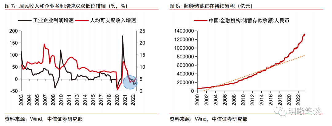 宏观环境面临短期和长期变化的交织,短期内基调仍是“弱复苏”。长期来看,我国经济已由高速增长阶段转向高质量发展阶段,但在未来较长的一段时间内,预计我国经济结构仍将处于调整过程之中,在经济的新旧动能切换之际,经济增速中枢出现一定程度的回落也属正常;中短期而言,私人部门需求偏弱的问题较为突出,一方面,居民收入和企业盈利仍低于疫情前的中枢水平,收入和盈利承压导致了当前私人部门需求偏弱的现象,另一方面,私人部门扩大内需的意愿也处于偏低水平,疫情以来,我国超额储蓄大幅累积,且截至目前并未显现出快速释放的迹象。在长短期变化的交织下,经济的复苏进程可能将是波浪式的、而非一帆风顺。尽管我国经济基本面长期向好的趋势没有改变,但短期内,在内需偏弱这一因素的压制下,“弱复苏”可能将成为我国宏观环境的一个关键词。