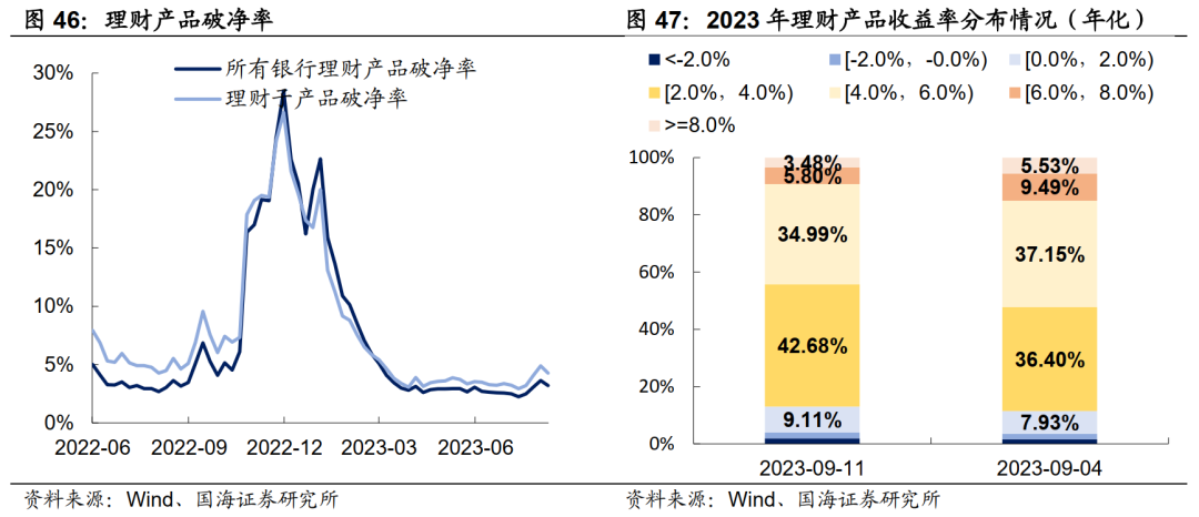 本周全市场理财产品破净率较上周略有下降,全部产品和理财子公司产品破净率分别收为3.2%及4.3%。