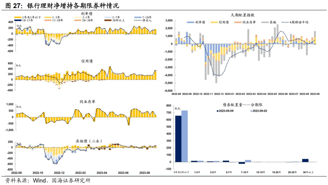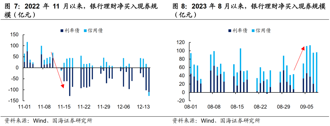 2022年11月初,赎回潮启动后,理财对利率债随即转为净卖出。而近期,理财对各券种仍保持净买入,尤其在本周,理财分别净买入利率债和信用债140.4亿元、345.4亿元,较上周增加12.4亿元、184.7亿元,增配力量仍然稳健。