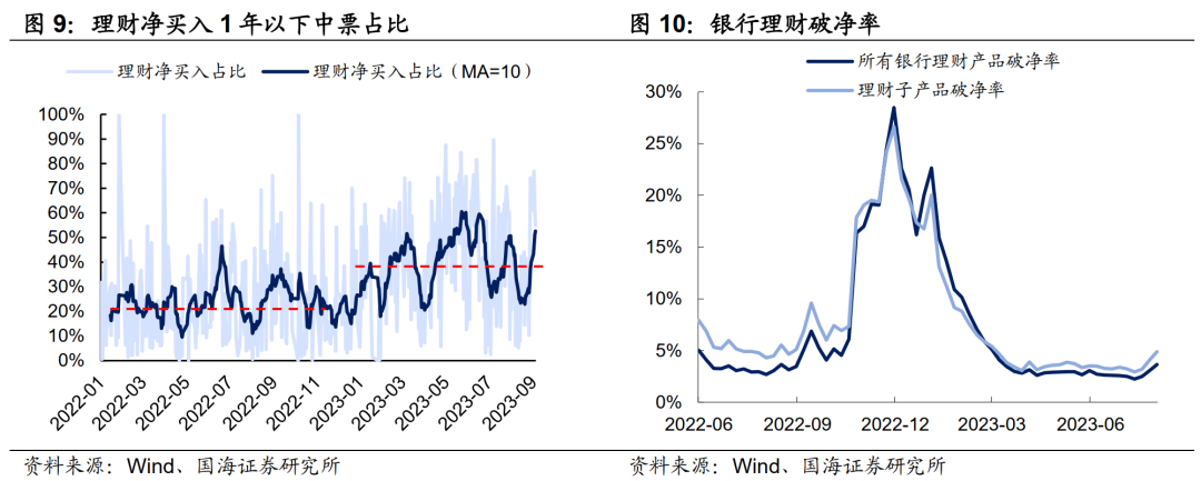 造成这一现象的原因有二:一方面,今年以来,理财配置短期化趋势明显,目前整体持仓久期应显著低于去年“赎回潮”前夕,对利率变动敏感性也将不及去年11月时期强。另一方面,理财破净率已长期处于较低水平,积累了一定的净值“安全垫”,负债端尚没有出现大规模系统性的赎回。