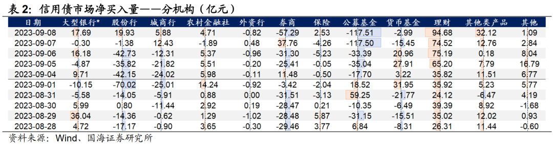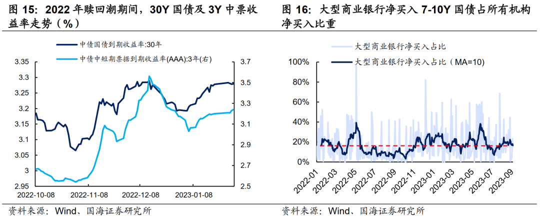 本轮公募基金遭遇一定抛压,因此,基金的主力定价品种将受到较大影响。从过往的现券交易情况看,基金对1-3Y信用债和20-30Y利率债的净买入占比中枢始终较高,分别在50%和30%左右,为相应券种的主要参与方,对其有主要定价权。因此,在基金遭遇赎回、大量抛售主力券种的情况下,3Y信用债及30Y国债收益率将有较大上行压力。