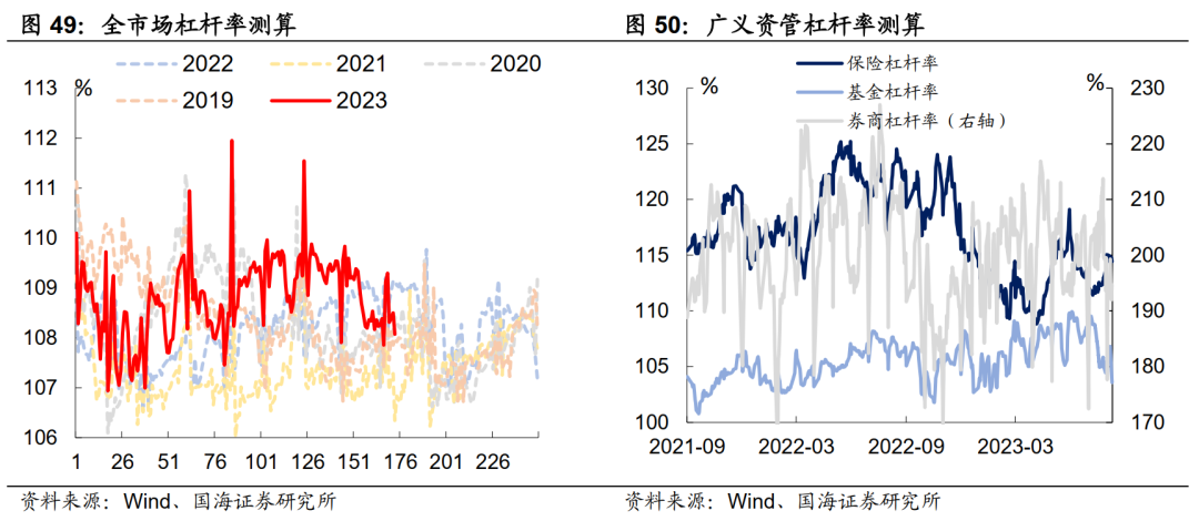 本周全市场杠杆率为108.1%,较上周降低1个百分点。广义资管方面,本周保险机构杠杆率录得114.4%,较上周降低0.6个百分点;基金杠杆率录得103.6%,较上周下降3.0个百分点;券商杠杆率录得194.7%,较上周下降0.5个百分点。