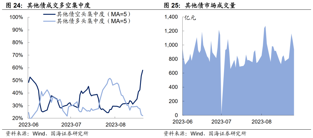 4)其他债(二级资本债和永续债),本周空头集中度大幅上行,主要表现为基金净减持力度增加,本周累计净减持545.6亿元,较上周增加529.1亿元。