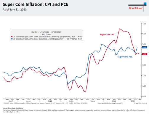 2. 他对通胀再次抬头不是太担心,但是认为从21年下半年就达到年化4%多的超级核心通胀(下图蓝线,即核心服务扣除房屋项)一直降不下来会令联储担忧。