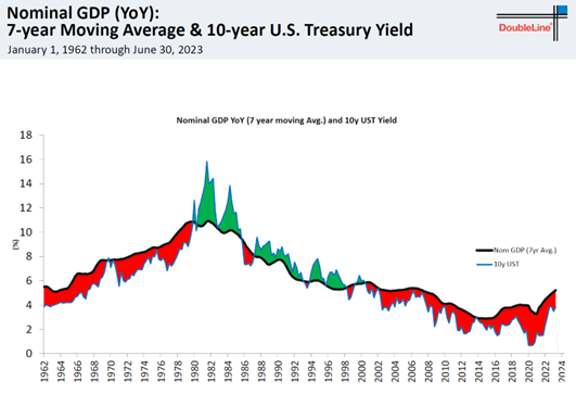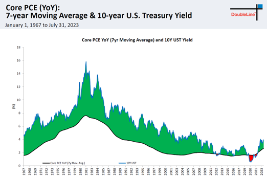 Gundlach这次分享两个他用来判断长期美债走势的图。下面这个是7年移动平均PCE(黑线)和十年美债(蓝线)。美债的长期走势方向跟随PCE,目前长期PCE已经扭头向上一段时间。