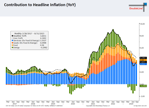 目前CPI涨幅主要是由服务部分(下图蓝色柱)组成。