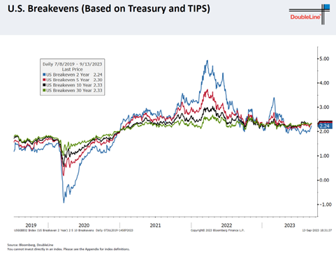不同期限的Breakevens通胀预期最近半年都没有大变动,表明市场对联储控制通胀的措施和态度有信心。