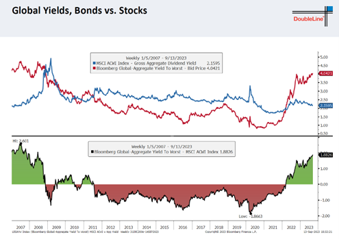 全球无风险利率和全球股票股息率之差回到了07/08年的高点,股票相对吸引力更差。