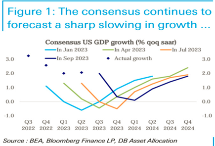 我在这里插一个德银的图,从22年下半年开始市场一致预期美国从23年Q2开始衰退,但是实际上衰退一直在推后。Gundlach也是其中一员,目前他最新的预测是24年1月份进入衰退。他认为不少主流预测衰退的指标在22年下半段都显出了衰退的迹象,只不过是拜登政府的巨额财政刺激干扰了这些指标预期实现的时间。