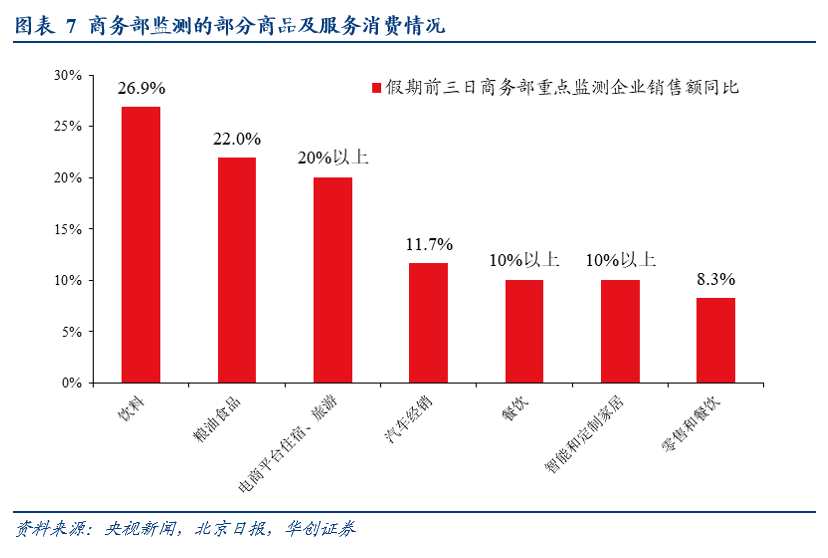 行业层面,据商务部商务大数据监测,假期增速较高行业的包括食品饮料、金银珠宝、通讯器材餐饮、住宿旅游等。