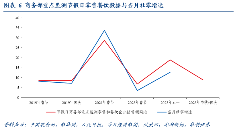 据商务部商务大数据监测,假期前七天,全国重点监测零售和餐饮企业销售额同比增长9%,或对10月社零增速有所拉动。从此前的经验来看,商务部公布的节假日零售餐饮增速,与当月社零增速呈一定相关关系。